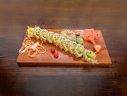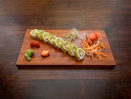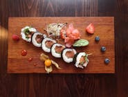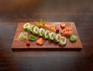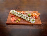 10 elementów / Maki z krewetką w tempurze, majonezem, sosem sriracha, ogórkiem, tykwą, sezamem. Na zewnątrz awokado, sos teriyaki, por. -