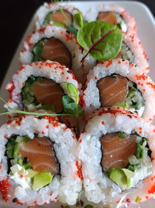 8x uramaki (tatar z łososia, awokado na zewnątrz polane sosem teriyaki, posypane sezamem)